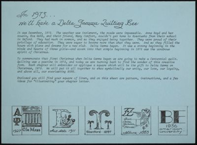 American University was chartered by Congress in 1893. Epsilon Kappa organized itself on the campus of American University on November 25, 1929, and then in 1935 began petitioning Delta Gamma for a charter. They were granted a charter in 1936 with eight members. On March 21, 1936, an installation banquet was held for 39 initiates at the Shoreham Hotel with about 125 participants. A tea followed on Sunday at the Sulgrave Club with nearly 400 guests in attendance. Members of Omicron-Adelphi, Rho-Syracuse, Chi-Cornell and Psi II-Goucher chapters and Baltimore, New York, Philadelphia and Washington alumnae chapters were present at the Installation, and many “braved devastating floods to attend.” Marguerite Winant, Omicron-Adelphi, was the Fraternity President at the time and presided over the Installation. Beta Epsilon’s first meeting room was in Gray Hall (a women’s dorm). Campus sororities were later moved to suites in the Letts-Anderson dormitories. Beta Epsilon is the 49th chartered chapter of Delta Gamma Fraternity, and was the first Delta Gamma chapter in the District of Columbia. Beta Epsilon was the second National Panhellenic Conference group on campus; Phi Mu was the first. Beta Epsilon participated in the installation of Beta Rho-George Washington and Beta Sigma-Maryland. In 1944, 12 Beta Epsilon women sold stamps to raise money for the war totaling $2,219. In 1947, the dean of women confided to alumna, Frances Lewis Stevenson, Zeta-Albion, a field secretary at the time, “Every girl who went through rush at AU this fall put Delta Gamma down as her first choice.” Beta Epsilon boasts their involvement in intramural sports, social events and commitment to service as high points of their chapter on the chapter website.